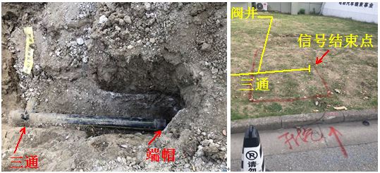 在信號結(jié)束的地方見到了管道的端帽,表明前面再無管道,開挖見到三通,確定了在空調(diào)機(jī)下的閥井與管道的連接關(guān)系。